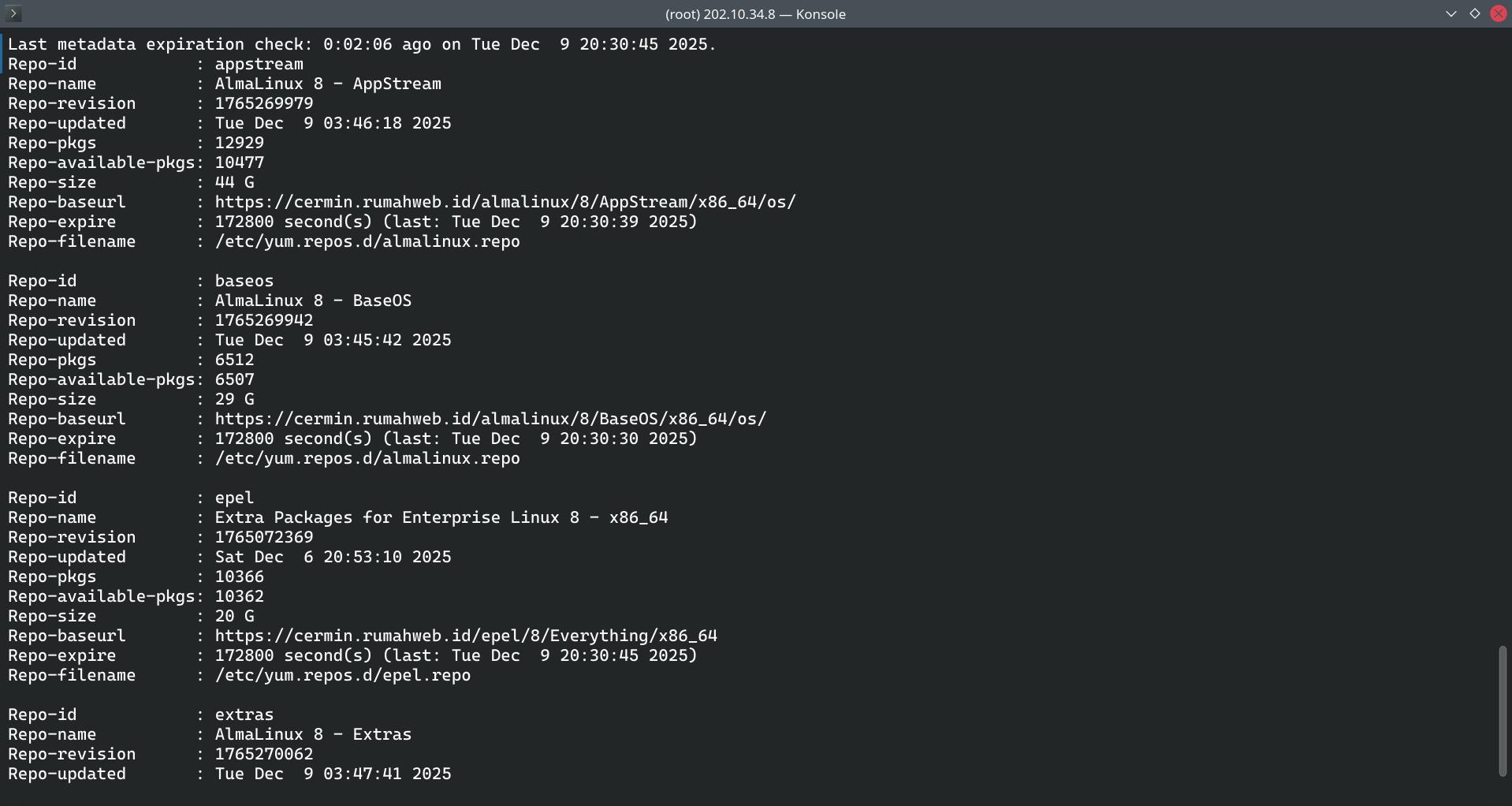 Untuk mengecek status repository Almalinux yang sudah Anda buat sebelumnya, Anda bisa menjalankan perintah berikut:
