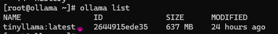 ollama listAnda akan melihat model tinyllama yang telah running sehingga tidak memerlukan ollama serve.