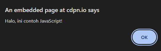 Saat kode tersebut dijalankan, browser akan menampilkan pesan pop-up. Ini adalah contoh sederhana bagaimana JavaScript menambahkan interaksi pada halaman website.