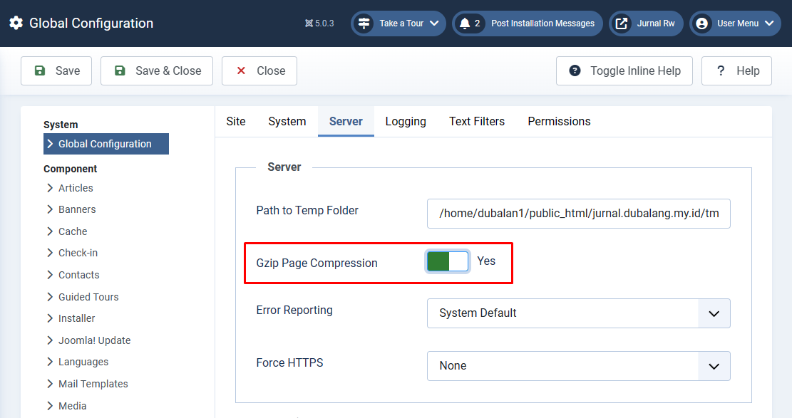 Aktivasi Gzip compression di Joomla dapat dilakukan melalui menu System > Settings > Global Configuration > Server.