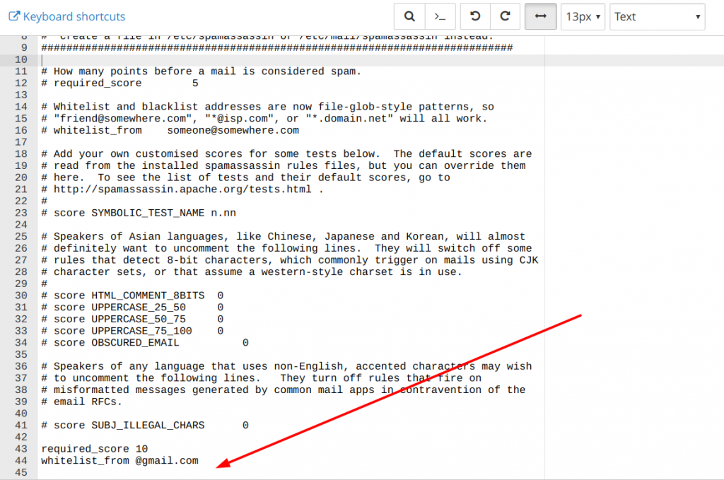 - Pada tiap baris, tambahkan “whitelist_from” di depan alamat yang akan di whitelist (tanpa tanda petik).