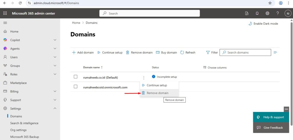 Berikut ini langkah-langkah menghapus domain dari akun microsoft 365.