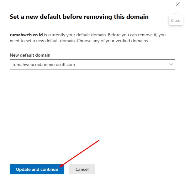 3. Pilih opsi Remove Domain, alihkan domain menggunakan domain yang aktif atau menggunakan default domain onmicrosoft.com, lalu pilih Update and Continue.