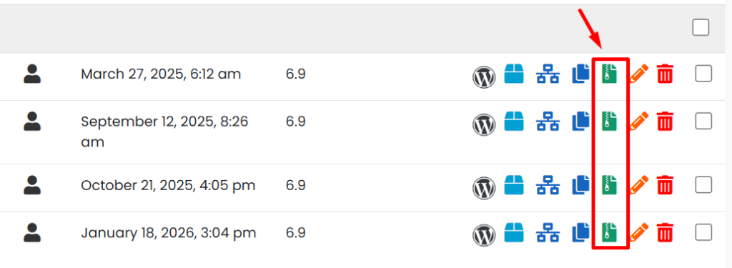 Softaculous menyediakan dashboard khusus untuk melihat seluruh daftar backup yang tersedia, termasuk ukuran file backup dan opsi pengelolaannya.