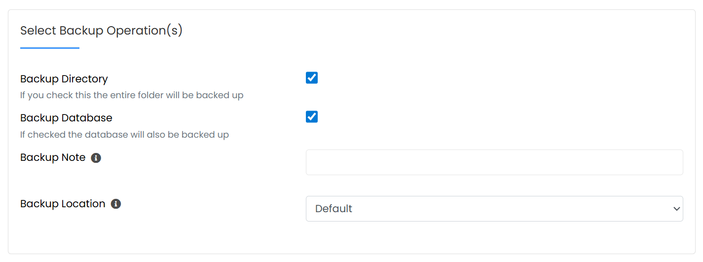 - Pastikan bahwa backup directory dan database tercentang seperti gambar di bawah ini. Anda juga bisa menambahkan catatan atau menyesuaikan lokasi penyimpanan file bila ingin melakukan custom.