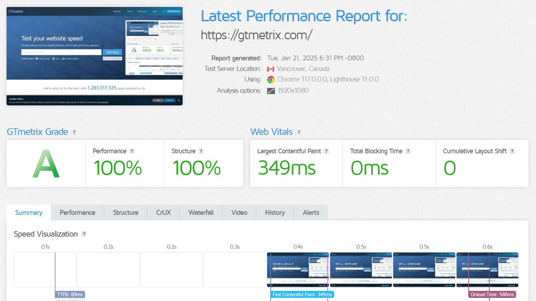 GTMetrix adalah tools online yang dapat menganalisis performa website untuk membantu pengguna dalam memahami kecepatan dan efisiensi website. Ditambah lagi dengan dukungan Lighthouse yang mampu menghasilkan laporan kinerja secara menyeluruh disertai dengan beberapa tab, visual grafik, dan insight yang lebih mendalam.