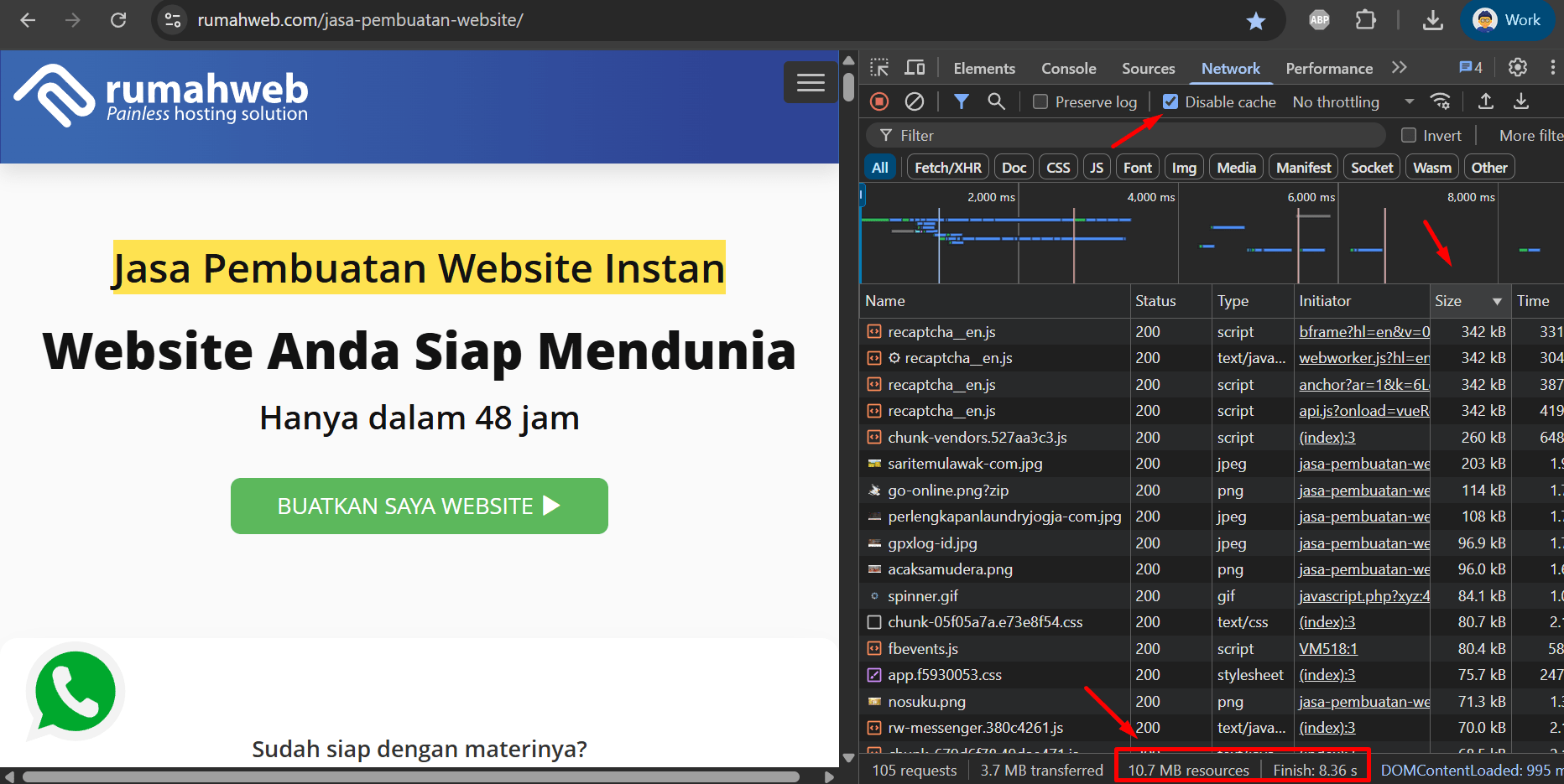 Dari screenshot diatas, diketahui bahwa page load halaman tersebut berkisar sekitar 10MB dengan waktu muat sekitar 8 detik. Anda bisa klik submenu Size untuk melihat ukuran file yang dimuat dari yang terbesar sampai yang terkecil, lalu lakukan optimasi.