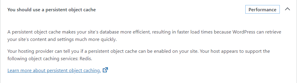 Selanjutnya adalah You should use a persistent object cache dan rekomendasi ini masuk dalam kategori performance. Dimana WordPress menyarankan untuk mengaktifkan object cache seperti Redis.