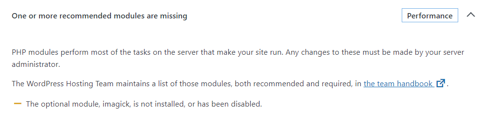 Rekomendasi selanjutnya adalah one or more recommended modules are missing, dimana hal ini disebabkan karena terdapat module PHP yang direkomendasikan seperti Imagick yang belum aktif.