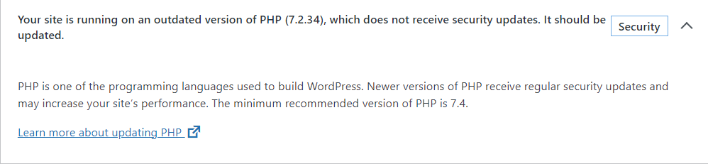 Notifikasi Outdated Version of PHP tampil pada WordPress Site Health disebabkan karena versi php yang digunakan masih menggunakan versi lama, dimana pada versi terbaru WordPress saat ini merekomendasikan minimal menggunakan versi PHP 8.1.